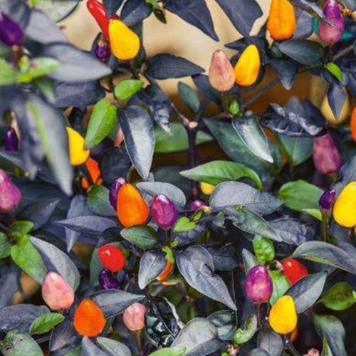 These plants are very similar to the Twilight Pepper plants, but instead, have dark purple foliage that makes the pepper pods stand out even more. Plants produce heavy yields of small, conical pods that vary in color – red, purple, yellow, pink, and orange.