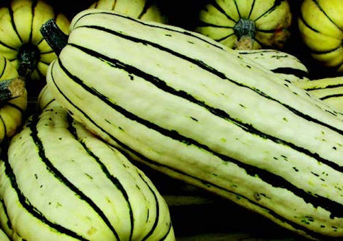 Also called "Sweet Potato." Vining-type sweet-potato squash that grows quite tall. Cream-colored, green-striped fruits are longer than our ‘Sweet Dumpling’, with flesh that’s yellow-orange, rich, delicate, creamy and incredibly sweet, with a sweet-potato like flavor that’s ideal for baking or stuffing. No peeling required. Eat it all!