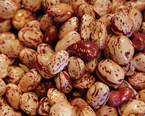 The original re-fried bean in Mexican cooking, in tacos and in chili. Most pods are borne near the top of short, half-runner type plants. Light buff colored beans, 5 to 6 per pod, are speckled with reddish-brown mottling. Dries to shell stage in about 85 days. Can also be grown as a pole bean.