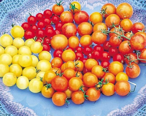 A full spectrum of colors including gold, orange, yellow, red, pink, purple, white, green, chocolate, bicolors, etc. Colorful fruits are sweet and bite sized.