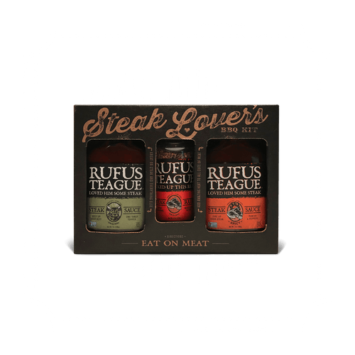 Rufus Teague knows that you don't mess with steak. So listen up if you think steak by itself is as good as it gets. This... gift kit... will... change... your... mind. Definitely not your typical grocery store steak sauce slop. Nope, these sauces are bold and bright and work on everything. And you also get a bottle of the most amazing spice your steak can handle. All in one kit!