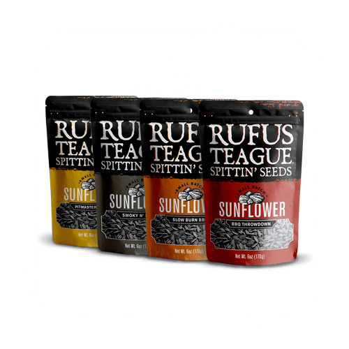 Stock up on all FOUR flavors of our amazing "Spittin' Seeds". You'll get a whole mess of our famous Rufus Teague BBQ flavor baked right into top-notch sunflower seeds. And each comes in a resealable, stay-fresh pouch that's perfect for camping, hunting, fishing, working outdoors and making your back pant pocket look cool.