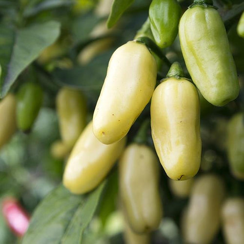 White Habaneros grow on sturdy 3 ft. tall plants that stand out gorgeously in your garden with their creamy-white colors. These lantern-shaped pods are smaller than traditional habaneros, only reaching about 2" in length, with the same wrinkly appearance.