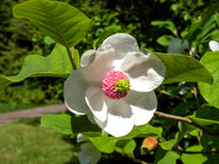OTHER: The Oyama Magnolia is a very large shrub to small tree native to eastern Asia. They are very ornamental, & will provide year round interest! The fragrant cup shaped flowers are up to 4" wide. These beautiful white flowers have showy bright pink stamens, & a long bloom time of 4 - 8 weeks. The flowers turn into big pink seed pods that measure up to 3" long. They look like little dragon fruit! In fall, the leaves turn beautiful shades of yellow to red while the seed pods are cracking open exposing the red seeds inside. These look similar to dogwood berries, but are not as uniformly shaped. The seeds are eaten by songbirds, game birds, squirrels, & other small animals.